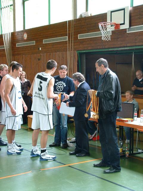 Verbandspräsident Geggus übergibt den Siegerwimpel und Pokal an Kapitän und MVP Goddek