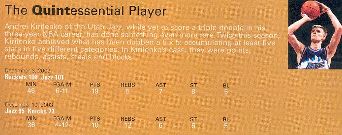 The Quintessential Player 5X5 a 5X5 is when a Player record 5 catagories with atleast 5 things in each catagory. IE 5 points, 5 assist, 5 blocks, 5 rebounds, and 5 steals. Kirilenko square with new 5x5 status You've heard of 20-10 performers and triple-double guys. Now meet that new statistical oddity: the 5x5 man. That would be at least five in each of the following stat categories – points, rebounds, assists, steals and blocks. Utah's Andrei Kirilenko had 19 points, five rebounds, seven assists, eight steals and five blocks recently against Houston. Only two other instances of a 5x5 were found in the past 10 years, one by Vlade Divac and the other by Jamaal Tinsley. And after Kirilenko joined the select company, he repeated the feat against New York. This is really something. Before Kirilenko, an NBA player had only reached at least five each of points, rebounds, assists, steals, and blocks in a single game just twice in the last 10 years. he did in a week what it took the nba 10 years to do. Denver's Marcus Camby became the fourth person in the past 10 years to achieve the 5x5 when the Nuggets hosted the Utah Jazz in 2004 Kirilenko did it again on January 3rd 2006