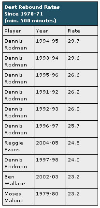 As a matter of fact, let's get some historical perspective on Evans's extraordinary rebounding performance. Based on the Rebound Rates for every player since 1970-71 when the NBA started tracking opponents' rebounds, Evans is moving into the exalted territory previously occupied by only one man: Dennis Rodman.