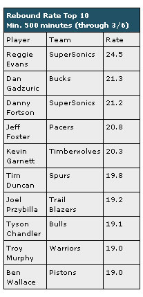 Garnett, meanwhile, is fifth, right behind Indiana's Jeff Foster . Garnett's Rebound Rate is still amazing, especially since he can't focus single-mindedly on rebounding as the four players ahead of him do. But for pure rebounding excellence, the two Sonics are a cut above right now.